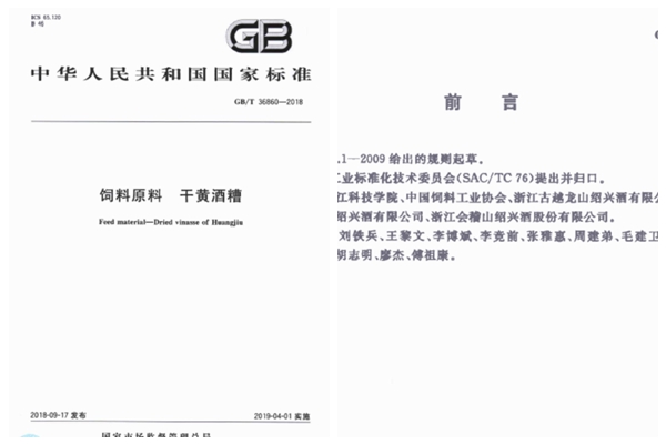 该标准自2014年底经中国国家标准化管理委员会立项以来,在中国饲料工业协会、国家黄酒质量监督检验中心、浙江古越龙山绍兴酒有限公司、浙江塔牌绍兴酒有限公司、会稽山绍兴酒股份有限公司等单位及领导和技术人员的共同努力和国家饲料及标准相关的专家指导帮助下,由国家市场监督管理总局、中国国家标准化管理委员会正式批准发布。浙江省农业生物资源生化制造协同创新中心主任毛建卫教授,我校刘士旺教授、朱银邦博士共同参与该标准的制定。
