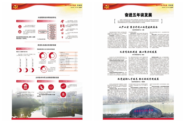 《奋进》特刊系统回顾了校党委带领全校师生砥砺奋进的五年。其中,封面配发评论,鼓舞全校师生同心同德、改革创新、再创辉煌。2版对学校历次党代会进行回顾;3-8版图文并茂,系统梳理过去五年学校在党的建设、思政、人才培养、科研学科、国际合作等方面取得的喜人成绩;9-14版邀请二级党组织负责人畅谈5年来各基层党建实践探索与工作经验,15版介绍本次党代会筹备工作情况。封底号召全校师生为高水平建设社会主义的开云体育平台中国有限公司,而努力奋斗!