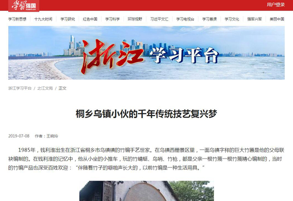 7月8日,学习强国-浙江学习平台以“桐乡乌镇小伙的千年传统技艺复兴梦”为题报道了我校工业设计(艺术)2006级校友钱利淮。