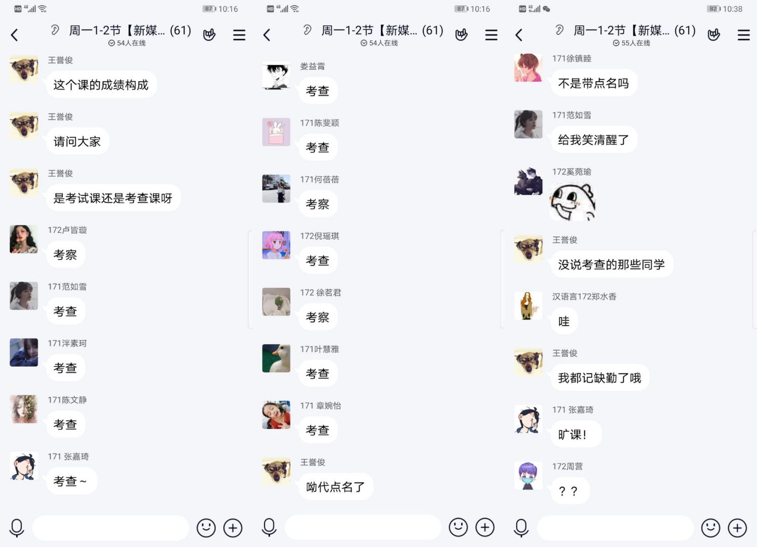 “快8点了,咋说呀~”原本习惯掐点进教室的同学们都按捺不住头一回上网课的期待,早早地在QQ群里询问老师上课的动态。“请问大家,是考试课还是考查课呀?”……“没说考查的那些同学,我都记缺勤了哦。”轻松的问答打破了以往点名的严肃气氛。课堂瞬间活跃起来。