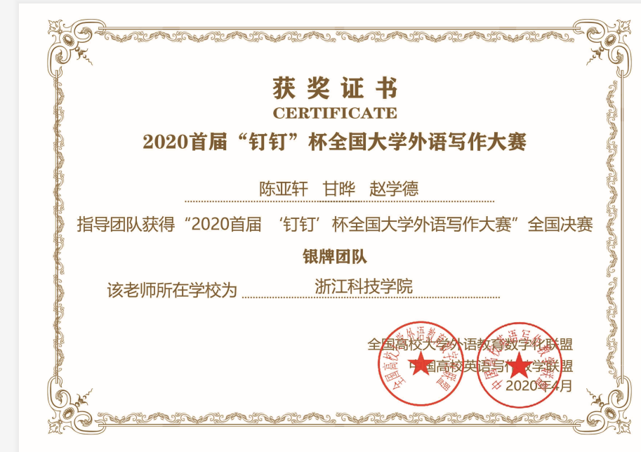 据悉,此次大赛是是由全国高校大学外语教育数字化联盟、中国高校英语写作教学联盟联合主办,全国高等学校大学外语教学研究会指导,钉钉(中国)信息技术有限公司平台支持,全国高校大学外语教育数字化联盟、中国高校英语写作教学联盟联合主办的覆盖全国在校大学生的线上外语写作比赛活动。比赛吸引了全国共近600所高校近30万名在校大学生参与。(外国语/中德学院 陈亚轩)