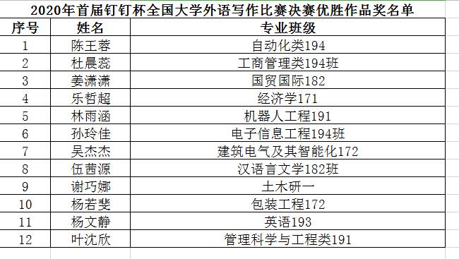 近日,历时3个月的2020 年首届“钉钉”杯全国大学外语写作大赛落下帷幕,全国3000多支高等院校团队进行线上角逐,最终60个团队荣获金、银、铜奖项。我校外国语/中德学院师生获得“银牌团队”称号,自动化类194陈王蓉等12名学生获得决赛优秀作品奖,陈亚轩、甘晔、赵学德获决赛优秀指导教师。