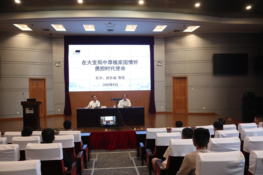 面对科技环境的变局,要科学应变,攻坚克难。赵东福引用尤瓦尔·赫拉利在《未来简史》中“人人都害怕改变,可历史唯一不变的就是它一直在变”,提醒新同学,疫情不仅仅影响了我们的生活,还深深地影响着经济、社会、政治和文化,它的影响可能会远超出我们的想象,让我们再一次看到社会变化的多样性和未来的不确定性。同时,新一轮科技革命与产业变革正在加速拓展,不断催生新产业、新业态,创新已经成为引领发展的第一动力,全球已进入科技与人才的全方位竞争时代,人才成为科技尖端领域争夺的战略资源。作为处于两个大局和下个“一百年”当中建设国家的主力军,同学们应当学会审视世界的巨变,要排除外部因素的干扰,克服战术上的压力,保持战略上的定力,树向学之念,立报国之志,站在时代前沿,以立足于解决人类发展共同面临的重大问题这样的高度,开始自己的学习与探索,在正视差距的同时,脚踏实地去追赶,不断攻坚克难,一步一个脚印地推动创新由量变走向质变,将个人的前途与祖国的兴盛结合起来,把家和国的观念根植在内心深处,把“为家尽孝、为国尽忠”的情怀作为当代大学生最应该具备的品质,让自我成长与国家发展同向而行!