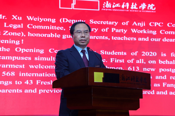 赵东福代表全校师生热烈欢迎来2020级新生。他说,面对疫情防控和求学升学的挑战,你们经受住考验,赢得了属于自己的胜利,以优良成绩考入浙江科技学院,祝贺你们。赵东福希望,全体新同学尊重科学,敬畏生命;广泛阅读,勤于思考;勇于实践,创新创业;服务社会,报效国家;包容互鉴,命运与共;用热情与汗水开创美好的未来。
