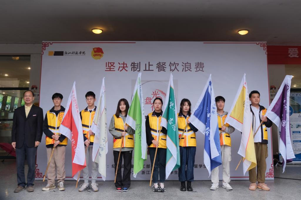 周加敏为各学院“坚决制止餐饮浪费”志愿服务队授旗,鼓励同学们继续以强烈的责任感和使命感切实践行节约粮食的传统美德。