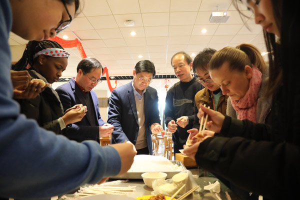 临近中午,干武东一行来到西和食堂,和留校中外学生一起包饺子迎新春。