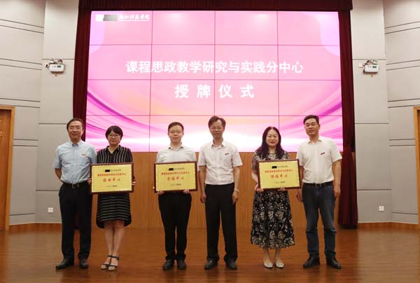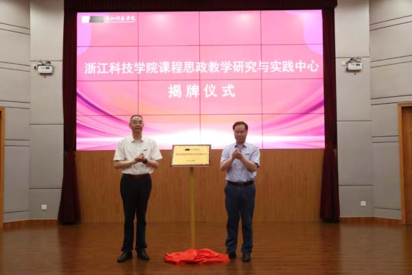 龚建立、赵东福共同为浙江科技学院课程思政教学研究与实践中心揭牌,符宁平、单胜道、万健为经管学院、人文学院、马克思主义学院授予课程思政教学研究与实践分中心。