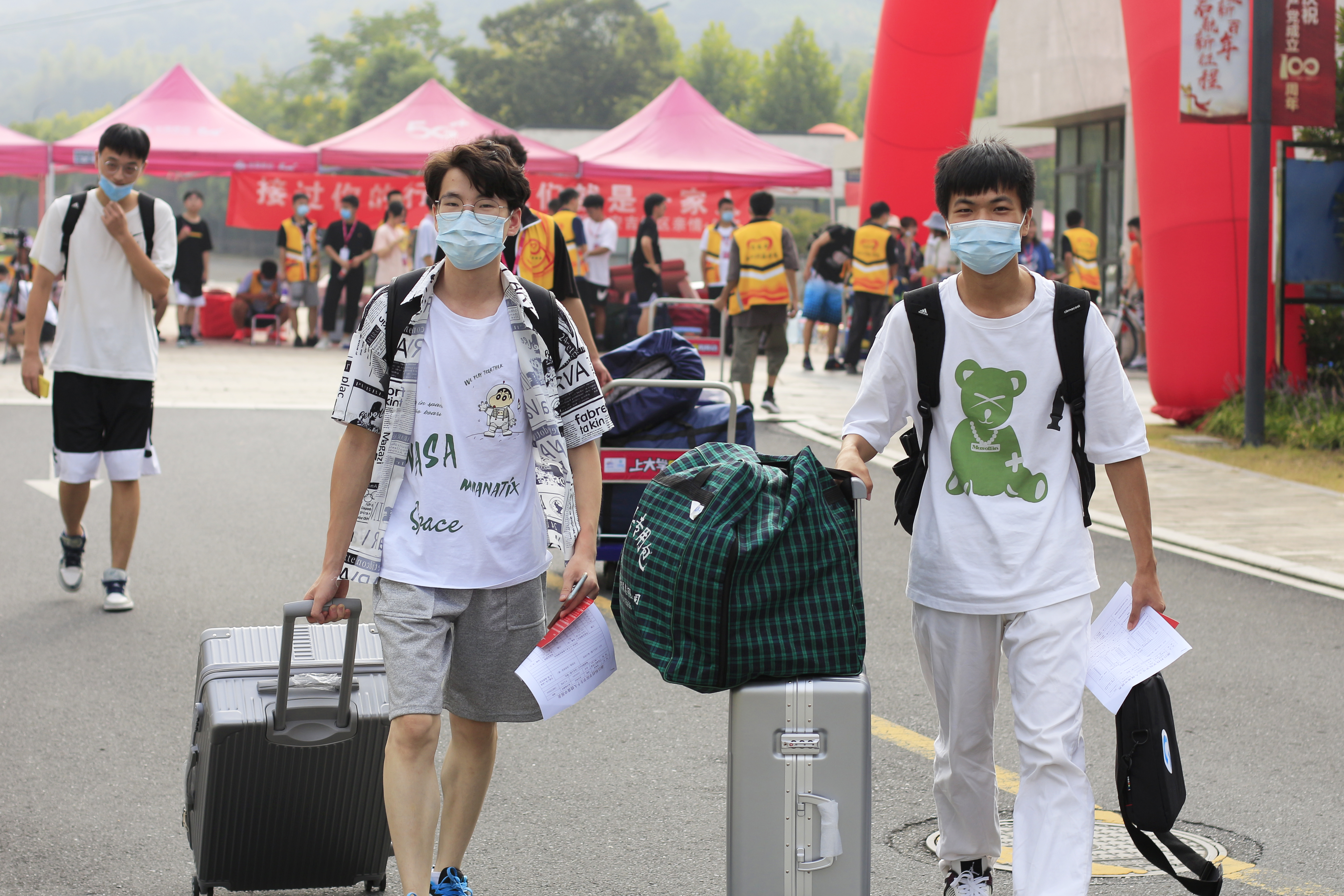 按照学校疫情防控常态化要求,新生分批错时报到,送行的家长均不能入校,新生们独立进校报到。