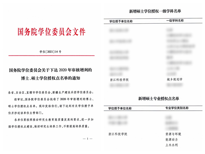日前,国务院学位委员会印发《关于下达2020年审核增列的博士、硕士学位授权点名单的通知》(学位〔2021〕14号),公布了批准的授权学科和专业学位类别名单。我校新增城乡规划学1个硕士学位授权一级学科点和资源与环境、能源动力、土木水利3个硕士专业学位授权点。