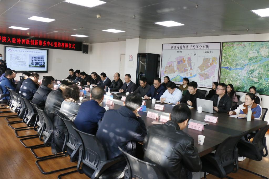 仪式结束后,浙江科技学院、浙江省造纸学会、龙游经济开发区管理委员会、龙游县特种纸科技创新管理服务中心等以合作为基点开展座谈会,探讨龙游特种纸平台与高校产业学校的发展可能性,深入探究龙游特种纸行业未来协同创新的发展方向。