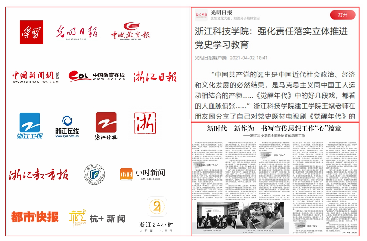 用青年人喜欢的方式“圈粉”青年人,学校党委要求做实“规定动作”,创新亮化“自选动作”,各二级党组织和基层党支部立足实际,策划实施了一批接地气、能落实、可操作的抓手载体,真正让党史学习“热”起来,师生党员“动”起来。一段党史,就是一堂课,全校上下将党史学习教育有机融入立德树人根本任务,教育引导青年学子发自内心地听党话、跟党走。建工学院在微信朋友圈掀起“学党史,共筑我的红色朋友圈”主题活动,师生围绕党史小知识、个人学习感悟等交流点赞,掀起党史学习感悟“分享潮”。艺术学院结合专业特色推出“百年芳华 初心如磐”师生艺术作品展,安吉校区联合孝源街道党工委推出微视频《光》,人文学院联合闲林街道党工委开展“听党说 逐梦想”——对话老党员活动,通过对话、拍摄微视频、撰写系列采访稿的形式,将党史学习教育与专业学习实践紧密结合,学院在一年一度的读书月为学生开出“红色书单”,重读《红岩》学生柴慧嘉说,“虽然不是第一次读了,这次读起来我好像更能从其中的人物故事里悟出不同的道理。”红色唱响 浙科寻音”活动、“红船杯” 党团知识竞赛、“五四和山红色毅行”……各类活动全面发力。