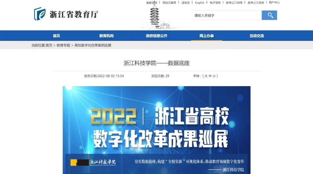 近日,学校“夯实数据底座,构建‘全精实新’可视化体系 推动教育领域数字化变革”入选2022浙江省高校数字化改革成果巡展,成果介绍学校以数据的可视化分析为抓手,围绕“数据资产一张图、学校总览一张图、学生一张表、教师一张图”构筑可靠的数据底座,为学校科学决策、精细管理、智能服务的实现提供基础。