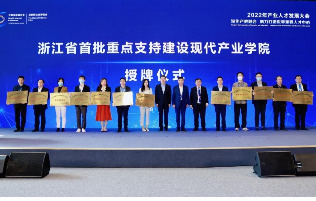近日,2022年产业人才发展大会在乌镇互联网国际会展中心举行,我校机器人产业学院建设成果在会展中心现场展示,同时机器人产业学院负责人及合作企业代表国自机器人负责人一同参加省首批重点支持建设现代产业学院授牌仪式。