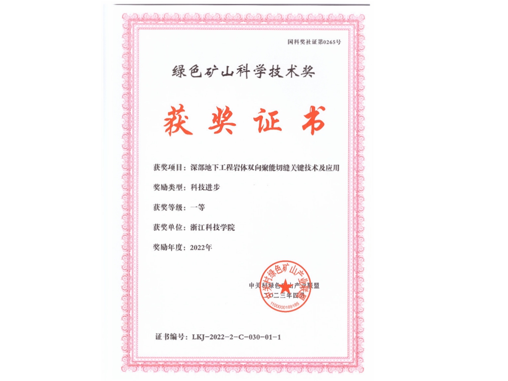 4月16日,我校主持完成的“深部地下工程岩体双向聚能切缝关键技术及应用”获2022年度绿色矿山科学技术奖(科技进步)一等奖,该项目以浙江科技学院为第一完成单位,邹宝平教授获“绿色矿山-青年科学技术奖”。