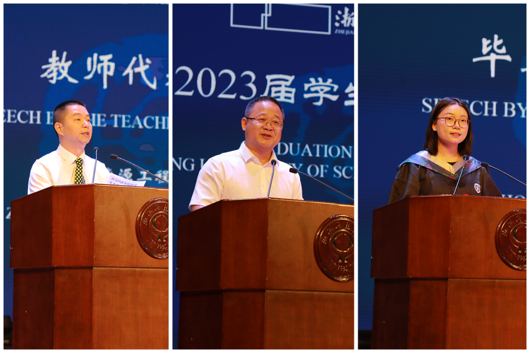 毕业生代表、理学院史琦回忆了与浙科的初遇,回顾浙科求学时光。她表示未来将带着老师的嘱托和母校的期许,用自己的奋斗书写无悔青春。