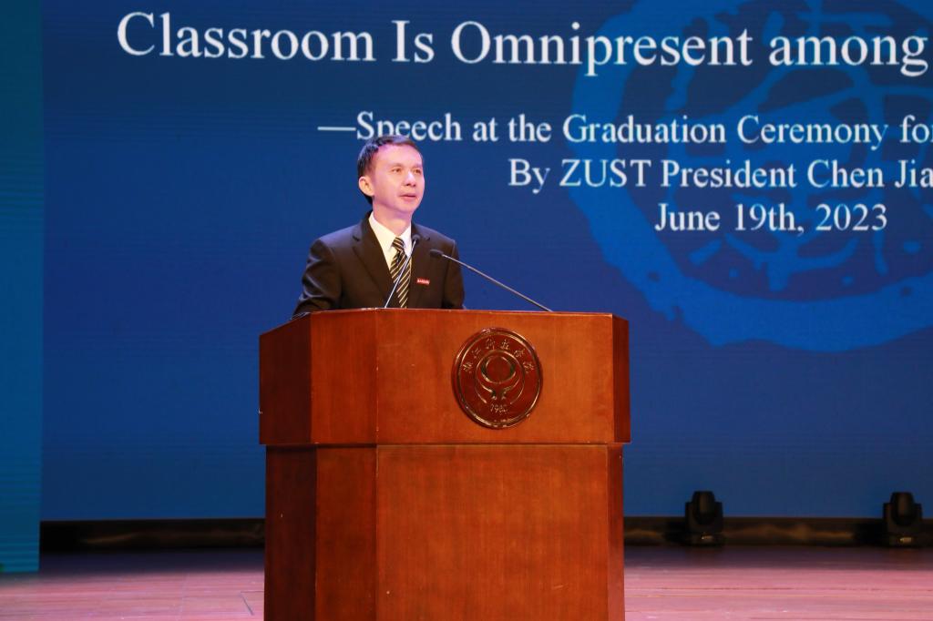 陈建孟以《山海无处不课堂》为题,为2023届毕业生上了“最后一课”。他充分肯定了同学们与时代同向、与学校同行,踔厉奋发、逐梦前行,在浙科留下了美好的青春印迹。陈建孟指出,毕业后同学们将进入“山海大学堂”学习,这所“大学堂”与传统学校不同,它看重学历,更看重学习领悟能力;它没有教科书,但有“必修课”;它没有围墙和教室,却时时有考题、处处是考场。如何才能在这所“山海大学堂”里取得好成绩?他建议毕业生上好三堂课:一要上好“时代大课”,厚植家国情怀、把准人生航向,希望大家将个人选择融入国家发展,行稳致远;二要上好“社会大课”,坚持知行合一,始终保持热爱学习、勇于创新的人生状态,擦亮人生底色;三要上好“生活大课”,正确对待得失、既不与自甘平庸为伍,也不与自身平凡为敌,不断涵养汇通江海的气概、滴水穿石的韧劲、自我超越的精神,逐光而行、向阳而生。