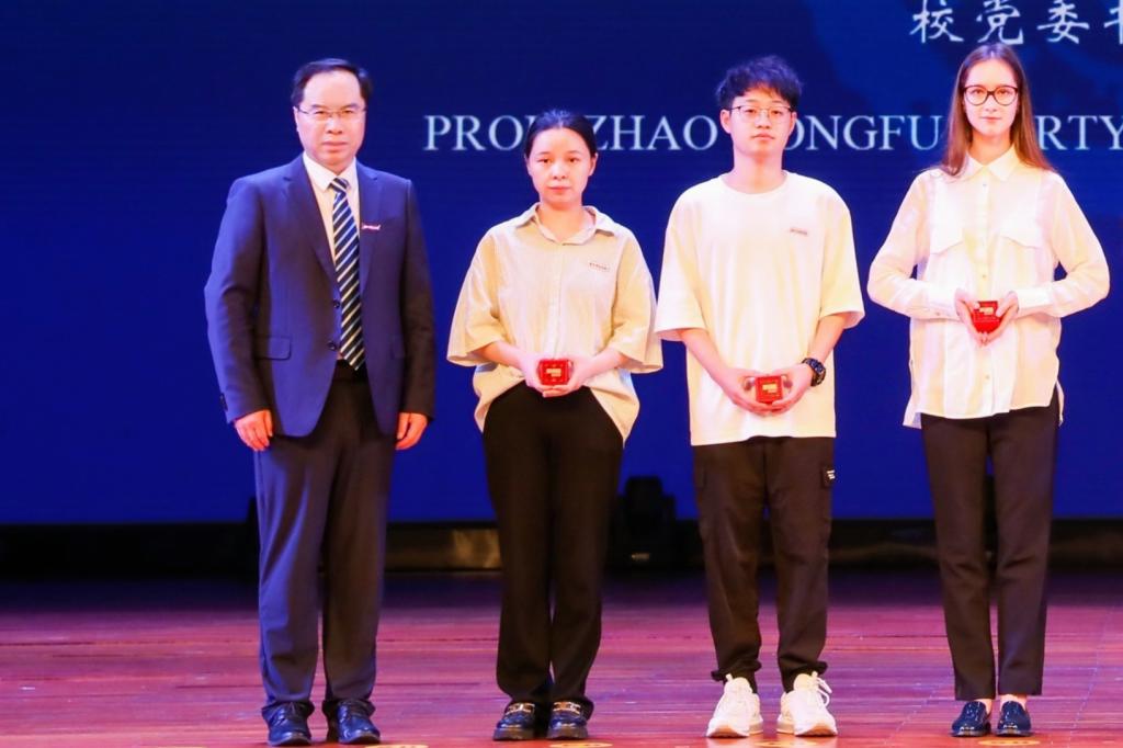 赵东福为本科生、研究生和留学生毕业代表颁发纪念章,为省级、校级优秀毕业生代表颁发荣誉证书。赵东福、陈建孟共同为获得卓越学子奖学金的学生颁奖。