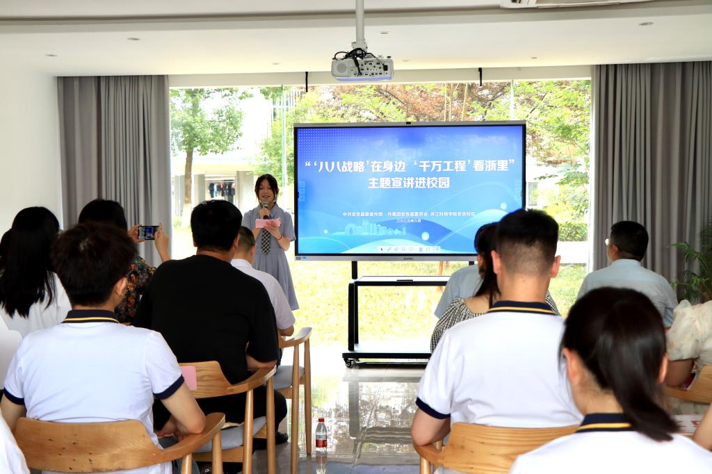 创新形式学,推动学习持续走深、走实、走心。“这次活动成为我们进一步学习以及更好贯彻‘八八战略’的一次机会,大家的理论素养都有了很大的提升。”学校组织教职工参加“潮新闻”客户端的“八八战略”线上知识竞赛,推动随时随地学,在答题竞赛中自检学习效果,学校参赛积分列省属高校前10位。以学校22个理论宣讲团和14个特色宣讲团为主体,以主题宣讲活动、微党课大赛、思政微课等为载体,师生着重围绕“八八战略”在浙江的生动实践,讲身边故事、亮个人观点、谈自身感悟,截至目前,各类宣讲活动开展百余场,覆盖人数约6000余人,1名教师在省部属高校“‘八八战略’在身边”主题宣讲暨微党课大赛中获一等奖,3位宣讲员“八八战略”宣讲视频入选“上新了,00后talker”(第三季)青年理论宣讲活动并在“潮新闻”客户端展示。进一步创新思政教育方式,上好“‘八八战略’在身边”的别样思政课,组织“美丽中国·美丽乡村”课程学生、青年马克思主义学社成员前往余村开展现场教学,96个暑期社会实践团队奔赴省内外开展理论宣讲、乡村振兴、共富实践、发展成就观察、支农支教等实践活动,引导青年学生全面、深刻和直观地感受“八八战略”的时代伟力。
