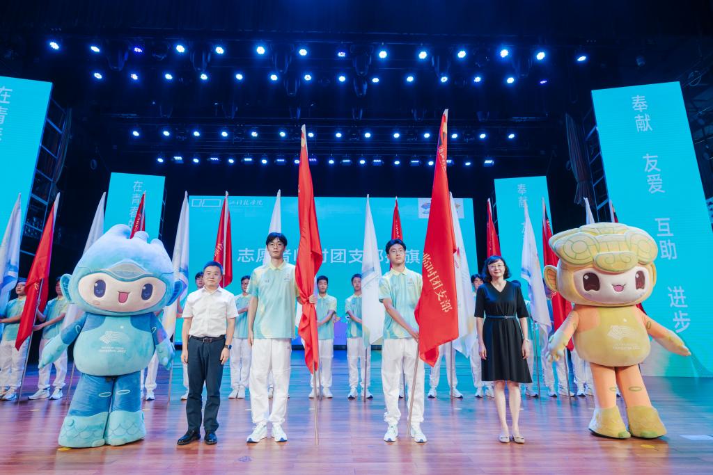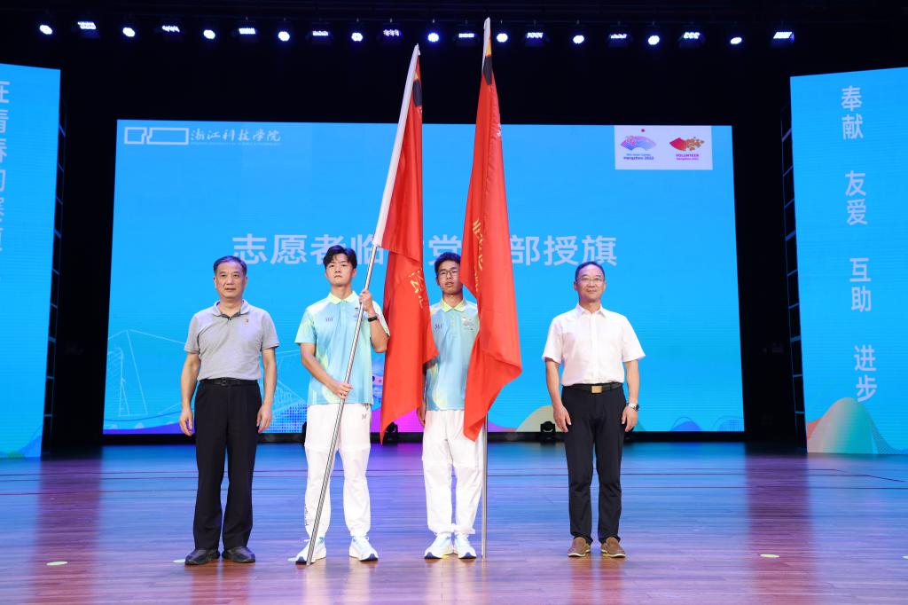 出征仪式上,鲍学军、冯军为杭州亚运会、亚残运会浙江科技学院志愿者临时党支部授旗。姜雯、郭彧为杭州亚运会、亚残运会浙江科技学院志愿者临时团支部授旗。为更好地组织和引导志愿者队伍,志愿者中成立临时党支部1个、临时团支部18个,让党旗、团旗在亚运场馆志愿服务的一线高高飘扬。