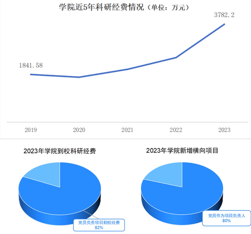 党建引领促发展。近年来,学院年度运行核心指标到校科研经费与高层次人才引进数突飞猛进,2023年取得“双超双突破”,其中,到校科研经费3782.20万元,人均科研经费达44万元,均创学院历史新高;实现两项高质量成果转化项目,金额近500万元;新增横向项目100项,党员项目负责人80项,占比80%;全年引进博士13人,其中1名国家级人才(创新型国千),1名省部级人才,实现高层次领军人才引进零突破;成功获批浙江省重点支持现代产业学院“集成电路高端装备”产业学院;2023年新增省部级及以上科研项目5项(含国家级项目1项),合同金额百万以上横向项目7项,项目负责均为党员。在大学更名及学院重大项目任务中处处展现学院师生党员风采。