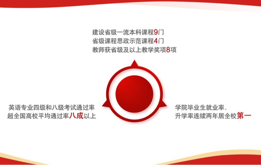 学院党委重视学风建设,以英语专业等级考试、就业、“考研”为重点抓手,组建教师辅导团队,出台激励政策。近年来,英语专业四级和八级考试通过率分别在95%和90%左右,超全国高校平均通过率八成以上;英语专业学生连续多年获“校特优学风示范班”称号;3名学生获“卓越学子奖学金”;3名学生获“大学生年度人物”称号;学院毕业生就业率、升学率逐年稳步提高,连续两年居全校第一。