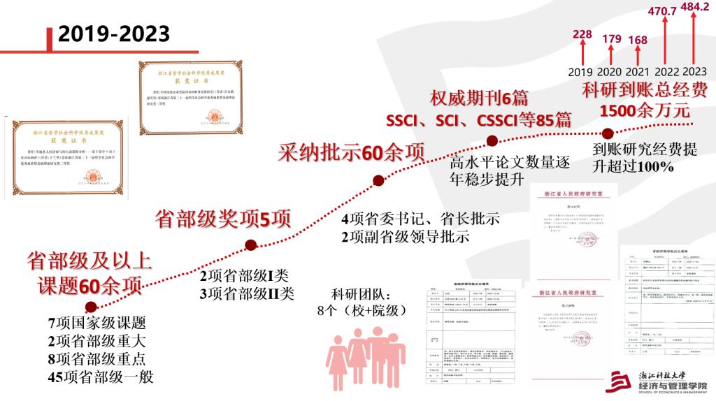 突出政产学研协同和校地企党建联建共建,致力于打造高水平新型智库,与民建浙江省委会共建“中德产业与科技研究智库”,与省对外贸易服务中心共建“浙江省对外贸易研究院”等。在教育部高校国别和区域研究备案的“德语国家研究中心”、学校与工信部共建的“中德工业文化研究中心”等平台发挥重要作用。多次荣获省科技进步奖、省哲学社会科学优秀成果奖等重要奖项;近五年,主持省部级及以上项目62项;发表权威期刊、一级期刊及SSCI、SCI、CSSCI等重要索引收录期刊论文85篇;出版专著32部。