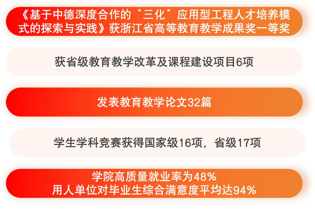 强化党建引领,借鉴德国模式深化教学改革。学院全面、系统地引进了德国应用科学大学的优质教育资源、教学管理体系和质量保证体系,专业建设严格对标教育部中外合作办学机构评估、本科审核性评估和德国专业认证等中德两国标准,现有专业全部通过德国专业认证。学院以学生为本,构建专业导师团队、企业导师团队,以深化“中德合作、产教融合、多元培养”为路径,开展应用型工程人才培养改革与实践,构建了基于中德融合的“国际化、工程化、个性化”(“三化”)应用型工程人才培养模式,形成“全方位、全过程”中德融合的国际化人才培养范式、“能力本位、双证并重”的工程化人才培养路径和“因材施教、因需施教”的个性化人才培养方法。
