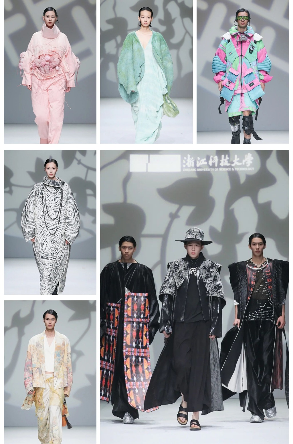 本届毕设作品秉承传统东方美学与国际时尚风范,思考可持续发展与人工智能设计革新,基于中国古典服装结构与制衣方法,提取传统纹样重组作为装饰,创新非遗印染技艺应用方式,辅之以AIGC⼈⼯智能生成、数码喷印等设计技术制作出新视觉服装,展现中国传统造物思想与⽂化内涵,让更多的⼈了解中国服饰结构和⼯艺⽂化,解锁更多的新中式服饰穿搭场景。部分作品采⽤环境友好型⽣物复合材料,生物可降解材料等进行设计,融合新时尚主义,以更多元、更先锋的当代青年设计力量,探索了可持续设计的更多可能性。(艺术学院)