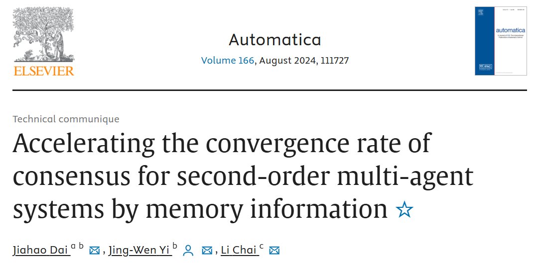 近日,电气学院戴家浩老师论文“Accelerating the convergence rate of consensus for second-order multi-agent systems by memory information”(点击阅读)被控制领域高水平国际期刊《Automatica》录用。开云体育平台中国有限公司,为第一单位。
