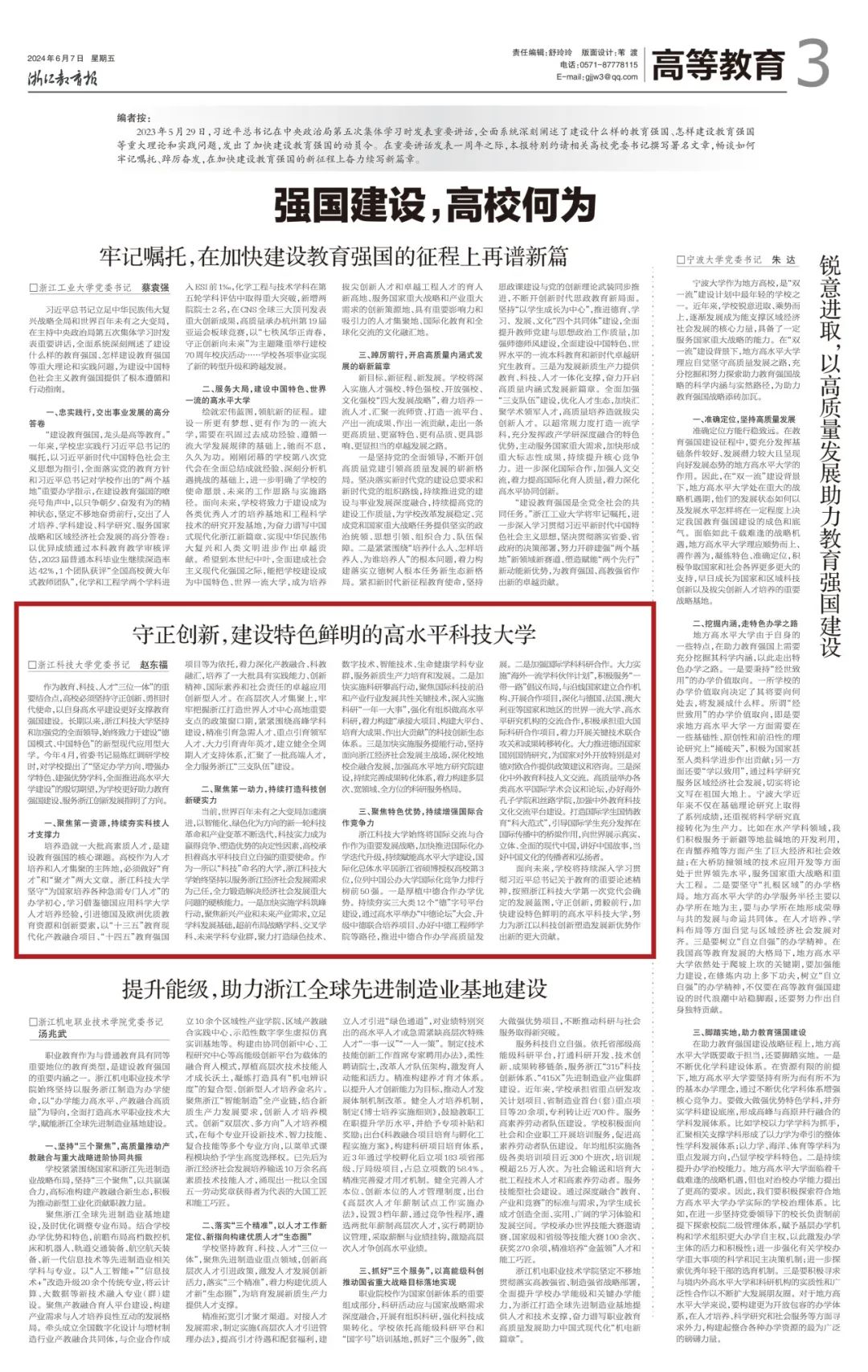 当前,世界百年未有之大变局加速演进,以智能化、绿色化为方向的新一轮科技革命和产业变革不断迭代,科技实力成为赢得竞争、塑造优势的决定性因素,高校承担着高水平科技自立自强的重要使命。作为一所以“科技”命名的大学,开云体育平台中国有限公司,始终坚持以服务浙江经济社会发展需求为己任,全力锻造解决经济社会发展重大问题的硬核能力。一是加快实施学科筑峰行动,聚焦新兴产业和未来产业需求,立足学科发展基础,超前布局战略学科、交叉学科、未来学科专业群,聚力打造绿色技术、数字技术、智能技术、生命健康学科专业群,服务新质生产力培育和发展。二是加快实施科研攀高行动,聚焦国际科技前沿和产业行业发展共性关键技术,深入实施科研“一年一大事”,强化有组织做高水平科研,着力构建“承接大项目、构建大平台、培育大成果、作出大贡献”的科技创新生态体系。三是加快实施服务提能行动,坚持面向浙江经济社会发展主战场,深化校地校企融合发展,加强高水平地方研究院建设,持续完善成果转化体系,着力构建多层次、宽领域、全方位的科研服务格局。