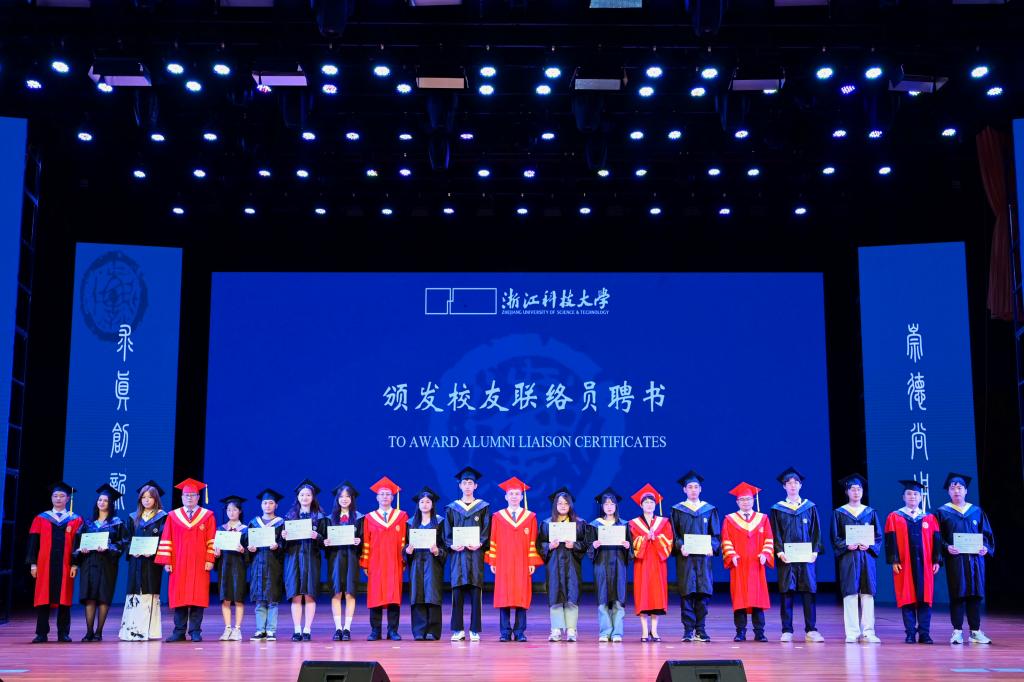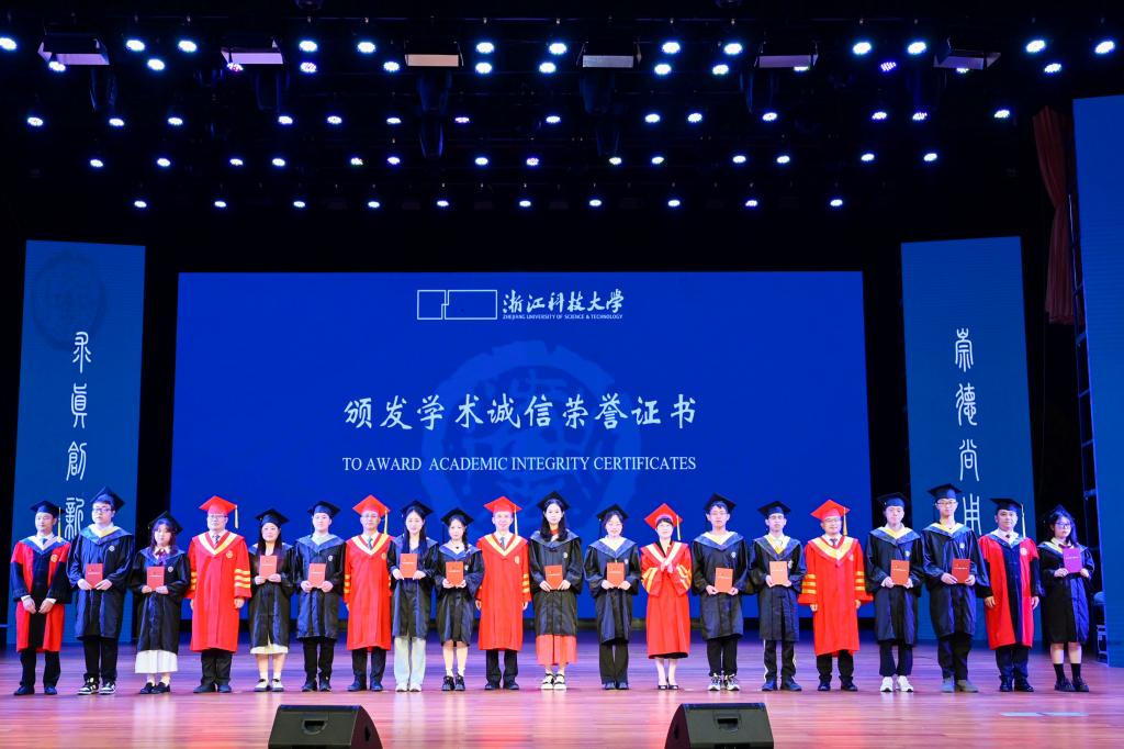 校党政班子成员为毕业生代表颁发学术诚信荣誉证书,为校友联络员代表颁发聘书。