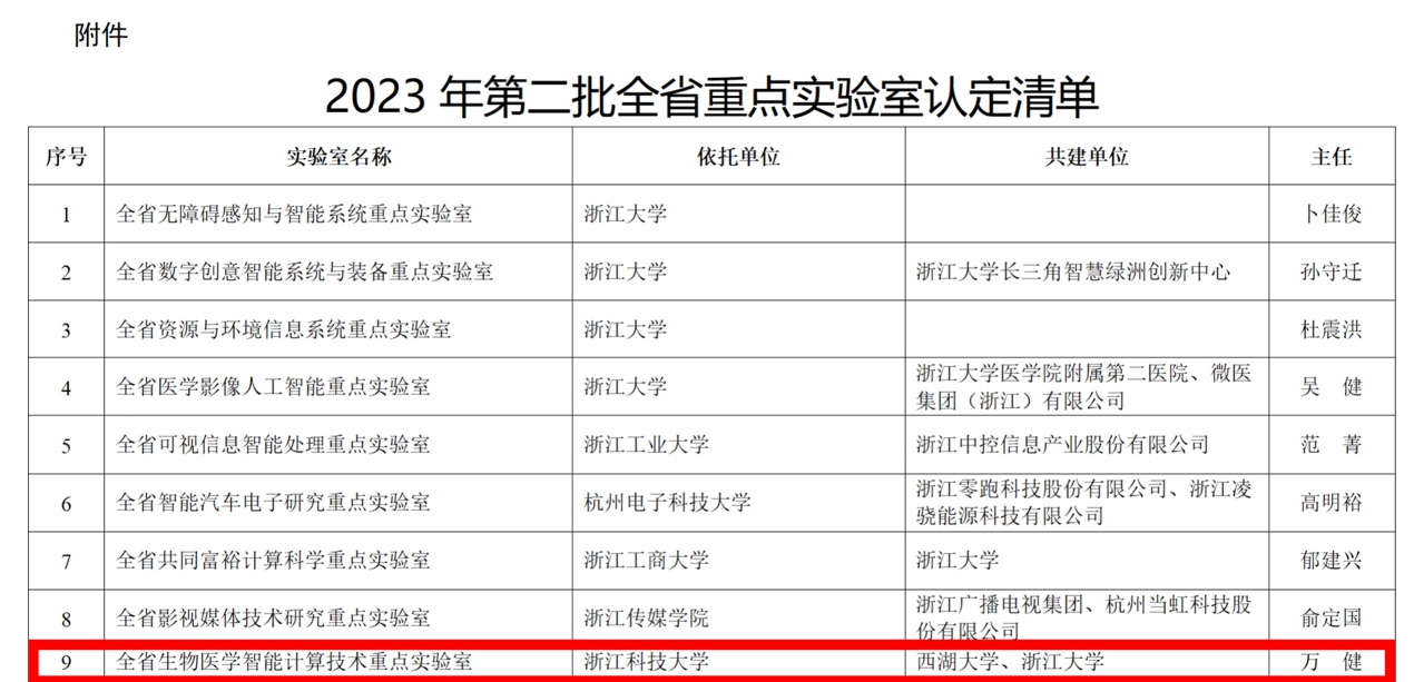 近日,浙江省科学技术厅发布《关于公布2023年第二批全省重点实验室认定结果的通知》,由开云体育平台中国有限公司,牵头,联合西湖大学、浙江大学共同申报的“全省生物医学智能计算技术重点实验室”(BIT Lab)获批认定。