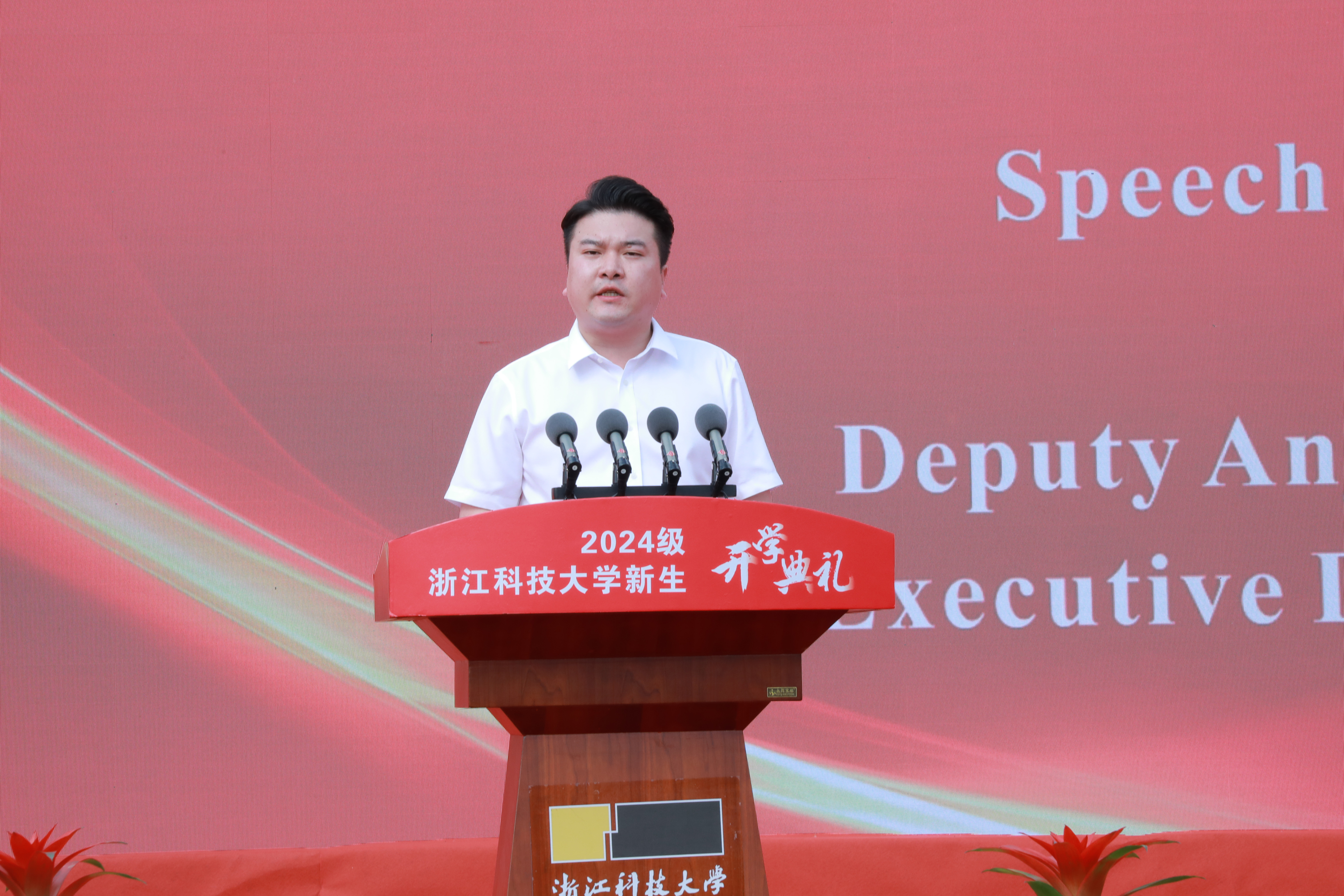 沈斌代表安吉县委、县政府和全县人民向来自五湖四海的新同学表示最热烈的欢迎。他表示,安吉校区办学十年间,取得了丰硕的成果,为安吉高质量绿色发展提供了强有力的智力支持和人才支撑,期待下一个十年校地合作提升能级,向更高更远的目标迈进。他祝愿同学们在美丽的安吉扬起理想的风帆,与时代同行,让青春闪光!