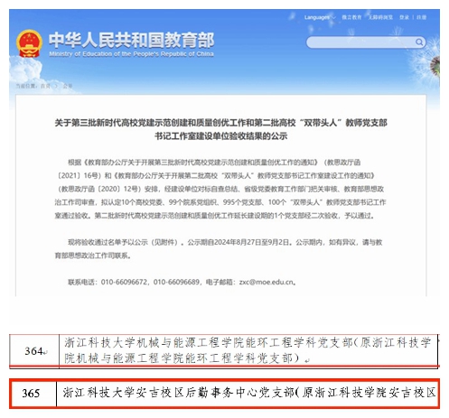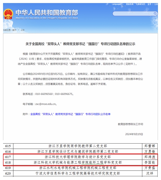 近日,教育部思想政治工作司公布了全国高校“双带头人”教师党支部书记“强国行”专项行动团队名单和第三批“全国党建工作样板支部”建设单位验收通过名单,我校机能学院能环工程学科党支部、理学院数学与统计系党支部入选“强国行”专项行动团队;机能学院能环工程学科党支部、安吉校区后勤事务中心党支部通过“全国党建工作样板支部”验收。