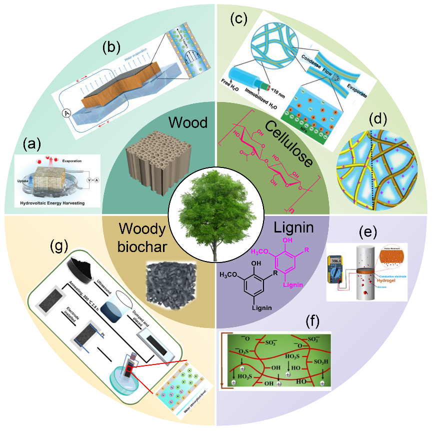 湿式发电技术是一种可从环境湿气中获得电能的新型绿色电能采集技术,近年来在物联网、人工智能和柔性可穿戴电子产品等领域表现出巨大的应用潜力。该综述论文全面介绍了木质纤维素生物质在湿式发电领域中的最新研究进展,包括天然木材、纤维素、木质素和木质生物炭等生物质基材料(气凝胶、水凝胶、薄膜、多孔碳等),涵盖了基于生物质材料湿式发电的工作原理、制备策略、性能表现和应用能力,可为高性能木质纤维素生物质基湿式发电技术研发提供理论依据与实践指导。