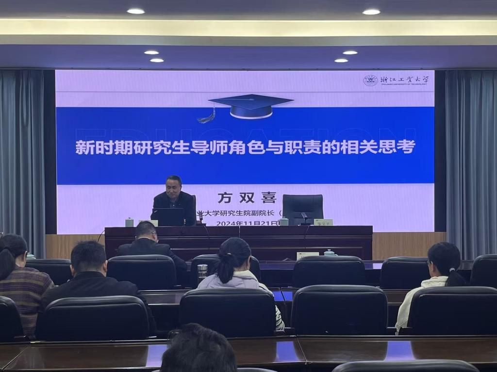 11月21日,学校举行2024年新增硕导培训会,研究生院相关负责人、学校2024年新增硕导和优秀硕导代表参加会议。浙江工业大学方双喜教授应邀为与会人员作主题报告。