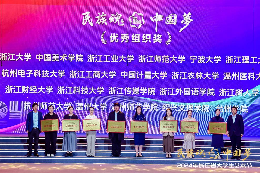 近日,2024年“民族魂·中国梦”浙江省大学生艺术节现场展演在浙江中医药大学举行。经组委会审核和专家组评选,我校选送节目获一等奖2项、二等奖4项、优秀歌手奖1项,学校获优秀组织奖。