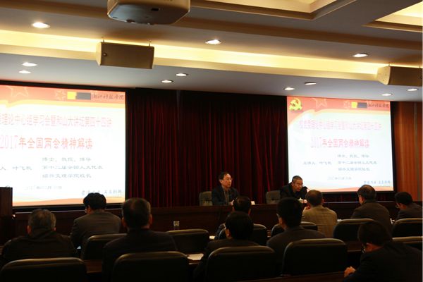 龚建立就学习贯彻全国“两会”精神,提出三点要求:一要讲政治,就要牢固树立“四个意识”,自觉向以习近平同志为核心的党中央看齐,紧密结合学习贯彻习近平总书记系列重要讲话、党的十八届六中全会和全国全省高校思政工作会议精神,围绕省委省政府重大部署,不断推进学校改革发展建设。二要谋发展,以更名大学为抓手,紧密结合学校今年党政工作要点,以提升内涵为根本,坚持深化改革,加快建设特色鲜明的现代化应用型大学步伐。三要强党建,要落实全面从严治党要求,继续深化“两学一做”学习教育,落实好意识形态工作责任制,加强党风廉政建设,积极营造清风正校园政治生态,以优异地成绩迎接党的十九大和省第十四次党代会胜利召开。
