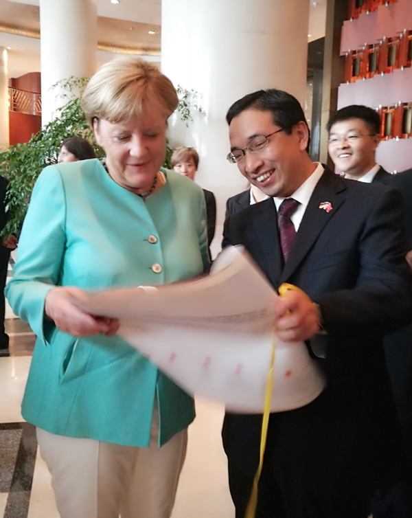 9月4日,德国总理默克尔(Angela Dorothea Merkel)在杭州凯悦酒店接见了郑友取一行。郑友取代表学校向默克尔赠送了精心制作的默克尔肖像漫画,以及我校中德合作培养学生代表联合签名的感谢信。她对我校中德合作30多年取得的成果表示赞赏,并与学校接待工作小组部分成员合影留念。