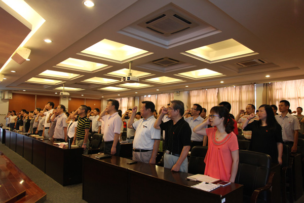 大会在雄壮的国歌声中开幕,校党委原副书记胡浙平领誓、全体党员重温入党誓词。