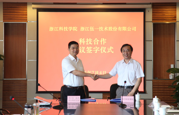 7月4日,我校举行与浙江伍一技术股份有限公司签订科技合作协议仪式,副校长万健教授与伍一公司总经理谢英俊博士分别代表双方签字。今后将发挥我校学科与人才优势以及中国浙江网上技术市场/浙江科技大市场的平台资源优势,加快推动科技成果转化为现实生产力,在科技人才资源整合、科技成果发布、平台公示、竞价(拍卖)以及企业技术需求、难题招标等方面加强合作。