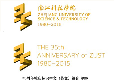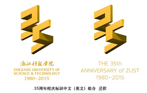 35周年校庆标识由艺术设计学院2000届校友苏杰设计,作品以空间感的建构作为主要设计风格,将3和5两个数字立体化,体现了浙江科技学院的工科院校背景,大气庄重,简约时尚,分横款与竖款两款,适应不同场合使用。用色采用与学校标识统一的黄黑色调,设计元素与校标中的阶梯、方块的概念一脉相承,和谐统一。在构图上采用向上、攀登的设计理念,体现学校“崇德、尚用、求真、创新”的校训精神,并彰显了学校“全面建设特色鲜明的现代化应用型大学”的办学目标。