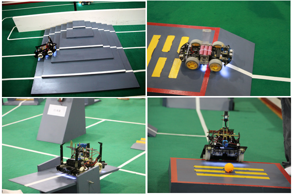 绿色场地内,灵巧的机器人出发,沿着规定路线一路“跋山涉水”,游经“普陀山”、“雁荡山”字样的高坡,也路过“西湖”、“千岛湖”等水域,遇到阻碍门还“自动”拐弯和360度旋转,最后登上“珠穆朗玛峰”,下坡回到终点,这是车型探险游的赛场。车型机器人按车重等级参加探险游、寻宝游、循线越野游和抢道越野游4个大项12个小项的比赛。小车要在规定时间内完成旅程,突破每个障碍、到达每个标地都可以加分。