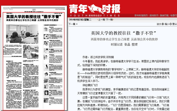青年时报9月23日以“英国大学的教授往往‘撒手不管’”为题(http://www.qnsb.com/fzepaper/site1/qnsb/html/2014-09/23/content_515033.htm),大篇幅报道我校国际化办学的收获。作者为学生记者郑如娴。