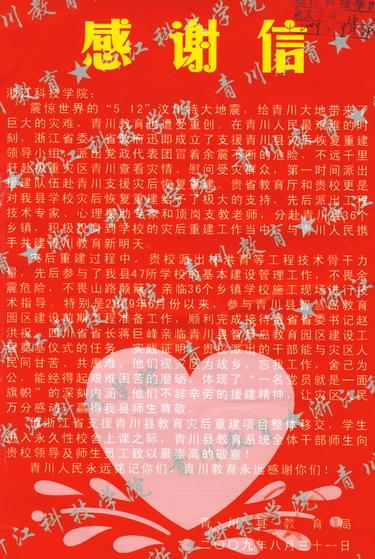 近日,青川县教育局向我校发来了感谢信,感谢谢我校选派人员赴该县支持青川地区教育事业灾后重建。