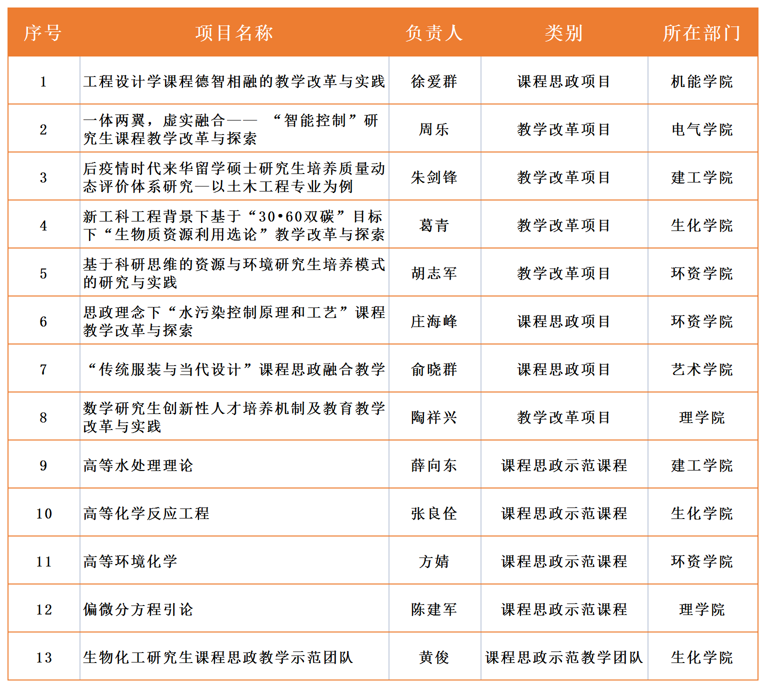 近日,浙江省教育厅学位办公布浙江省“十四五”研究生教育改革项目名单,我校13个项目获得立项,其中8个项目获得教学改革项目(课程思政项目)立项,4个项目获得课程思政示范课程立项,“生物化工研究生课程思政教学示范团队”获得课程思政教学示范团队立项。