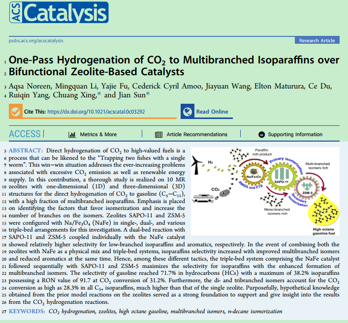 近日,我校生化学院18级巴基斯坦籍研究生Aqsa Noreen以第一作者身份撰写的《One-pass Hydrogenation of CO2 to Multi-branched Isoparaffins over Bifunctional Zeolite Based Catalysts》论文被催化领域国际顶级学术期刊《ACS Catalysis》录用,其影响因子为12.35(中科院大类1区,JCR 1区),这也是我校学生目前发表级别最高、影响因子最高的学术论文。