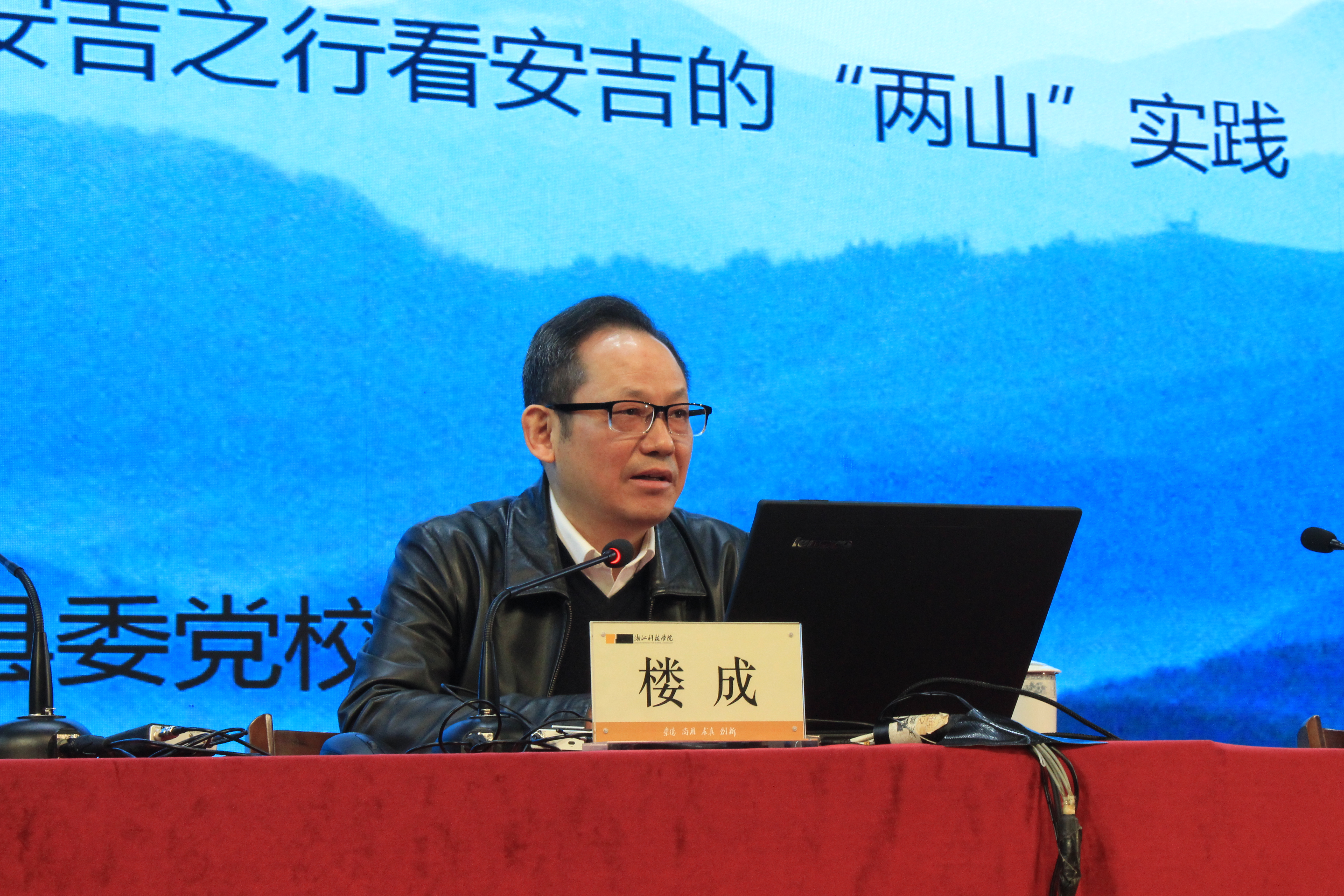 楼成从全球生态危机引发的时代之问、世纪之交的浙江之困,讲述了“两山”理念提出的深刻背景;从习近平三次安吉之行细述了安吉县“两山”之路的历史脉络。结合安吉“两山”实践,他指出,“用绿水青山去换金山银山”“既要绿水青山又要金山银山”“绿水青山就是金山银山”这三个阶段的转化不是自然而然就能实现的,需要找对路径和载体,他沿着时间脉络,使用大量实践例证,凝练总结了推动安吉“两山”实践的内在逻辑和经验启示。楼成从一位基层理论工作者的视角,结合习近平总书记第三次在安吉考察时的重要讲话精神提出要正确处理经济发展与生态建设的关系,坚持因地制宜发展生态产业,坚持城乡统筹协调发展,坚持群众路线取得群众拥护,与进俱进推动“两山”实践的新进程。