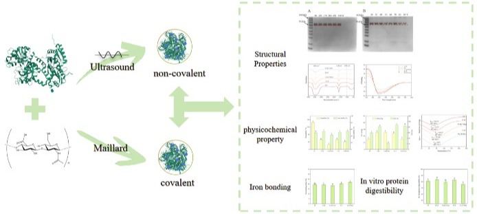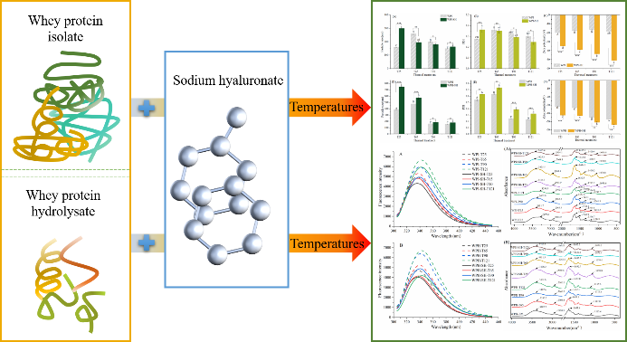 透明质酸在食品中的应用日益广泛,其钠盐已被批准添加至乳制品、饮料等食品中,因此其与食品组分的相互作用也日益受到关注。课题组从结构上证实了透明质酸及其钠盐和乳蛋白的结合,并研究了不同处理手段下两者的相互作用,发现透明质酸及其钠盐的结合不仅影响乳蛋白的结构和理化性质,还能改变乳蛋白的功能特性,如消化性、致敏性、铁结合能力等。研究结果为拓展透明质酸及其钠盐在乳制品中的应用提供了借鉴,并以“Effects of thermal treatment on the formation and properties of whey protein isolate/whey protein hydrolysate-sodium hyaluronate complexes”(点击阅读)(生化学院王丹丽博士为第一作者,龚金炎教授为通讯作者),“Effects of ultrasound and thermal treatment on the interaction between hyaluronic acid and lactoferrin: Preparation, structures and functionalities”(点击阅读)(硕士研究生王雨诗为第一作者,龚金炎教授为通讯作者)分别在《Food Research International》和《International Journal of Biological Macromolecules》上发表。