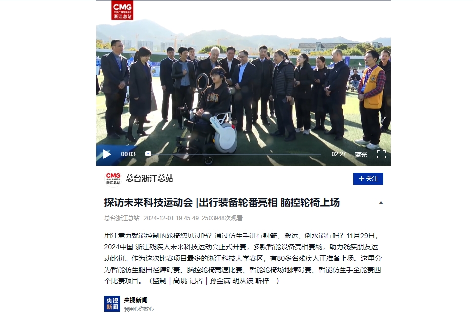 11月29日,2024中国·浙江残疾人未来科技运动会暨长三角科技助残·辅具创意创新大赛举行。其中,智能仿生手全能赛、智能仿生腿田径障碍赛、智能轮椅场地障碍赛、脑控轮椅竞速等项目在我校小和山校区田径场火热开展,央视新闻、新闻直播间、中国新闻网等媒体对比赛进行了报道。